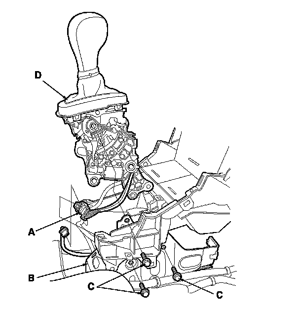 8. Remove the shift lever mounting bolts (C), then remove the shift lever assembly (D).