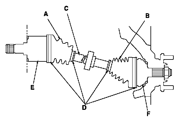 1. Check the inboard boot (A) and the outboard boot (B) on the driveshaft (C) for cracks, damage, leaking grease, and loose boot bands (D). If any damage is found, replace the boot and the boot bands.