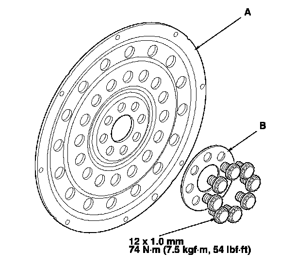 2. Remove the drive plate (A) and the washer (B) from the engine.