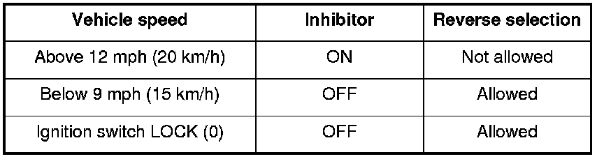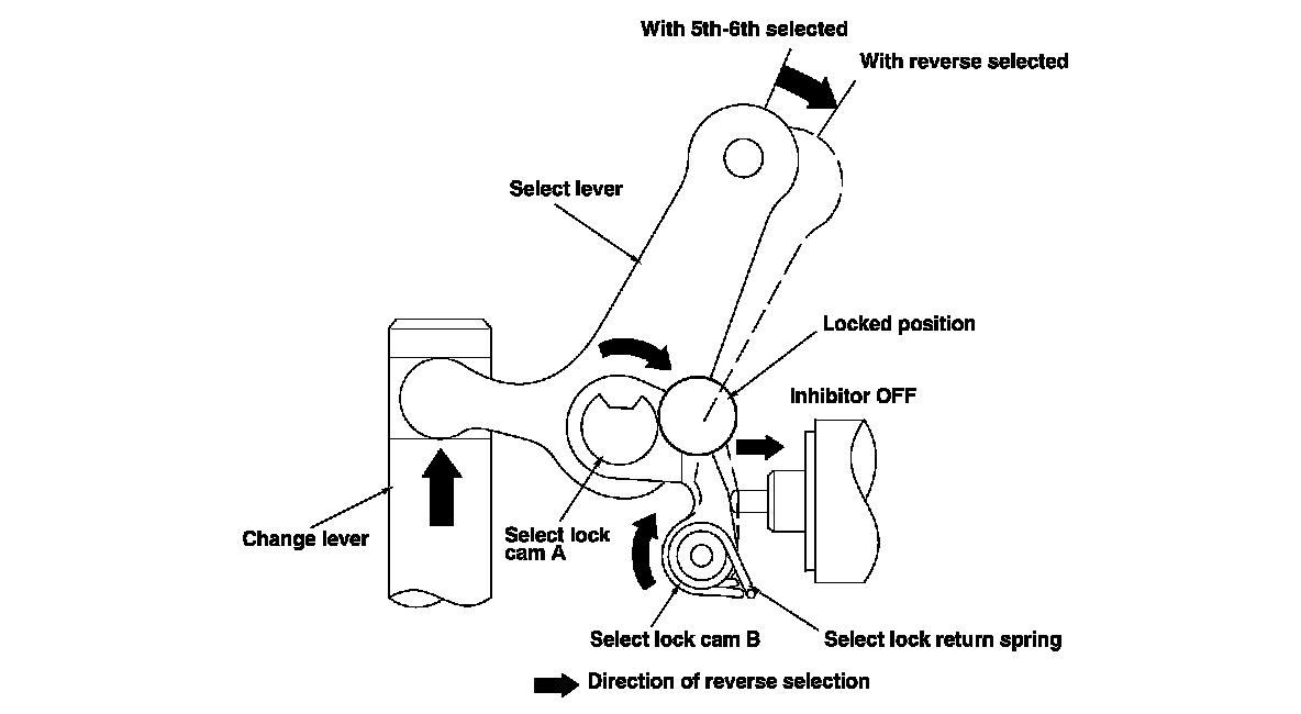 At vehicle speeds of 12 mph (20 km/h) or more, the ECM, which monitors the signals from the output shaft (countershaft) speed sensor, activates the reverse lockout solenoid, which pushes select lock cam B into the locked position. As a result, the select lever cannot rotate to the reverse select position, making it impossible to engage reverse gear. As the vehicle speed drops to 9 mph (15 km/h) or less, the ECM turns off the reverse lockout solenoid. The select lock return spring pulls back select lock cam B, enabling the select lever to move freely so reverse gear can be selected.