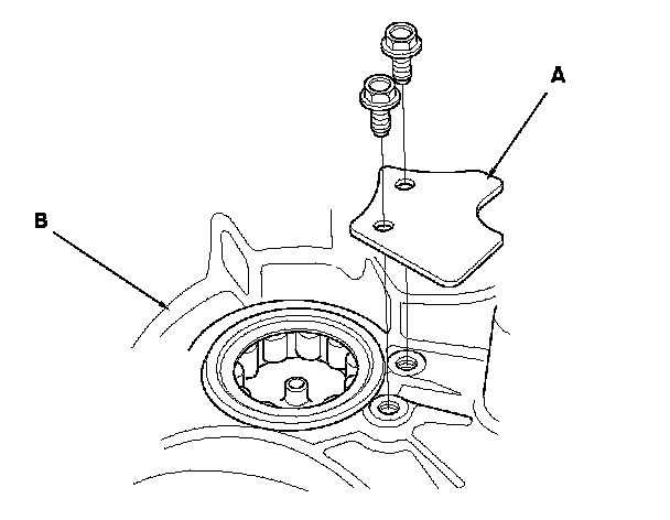 1. Remove the bearing set plate (A) from the clutch housing (B).