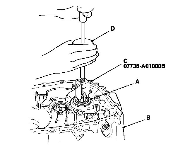 1. Remove the ball bearing (A) from the clutch housing (B) using the 20-40 mm adjustable bearing puller (C) and a commercially available 3/8''-16 UNF slide hammer (D).