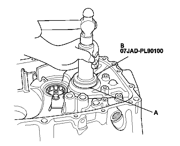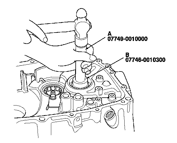 3. Drive in a new oil seal from the transmission side using the 15 x 135L driver handle (A) and the 42 x 47 mm bearing driver attachment (B).