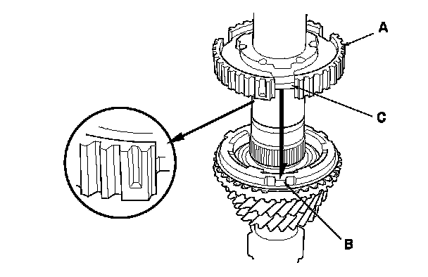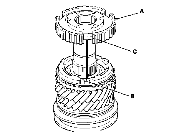 11. Install the 5th/6th synchro hub (A) by aligning the synchro ring fingers (B) with the grooves (C) in the 5th/6th synchro hub.