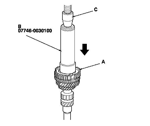 5. Press on the 3rd/4th synchro hub (A) using the 40 mm inner driver handle (B) and a press (C).