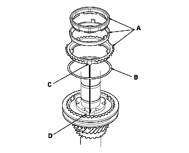 3. Install the double cone synchro assembly (A) with the synchro spring (B) by aligning the synchro cone fingers (C) with the holes (D) in 3rd gear.