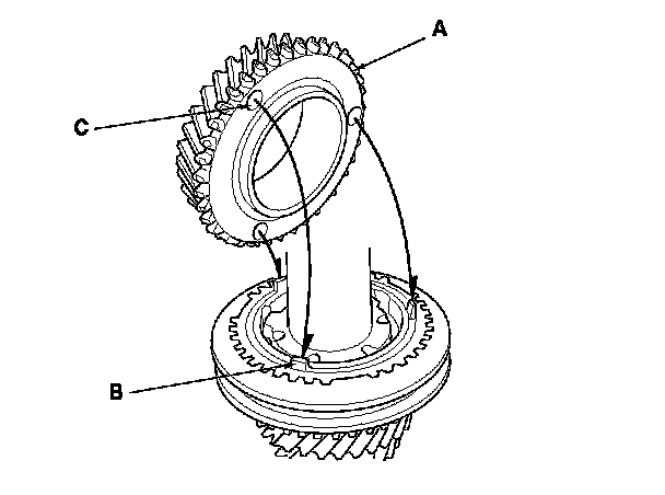 4. Install the 3rd/4th synchro hub (A) by aligning the synchro ring fingers (B) with the grooves (C) in the 3rd/4th synchro hub.