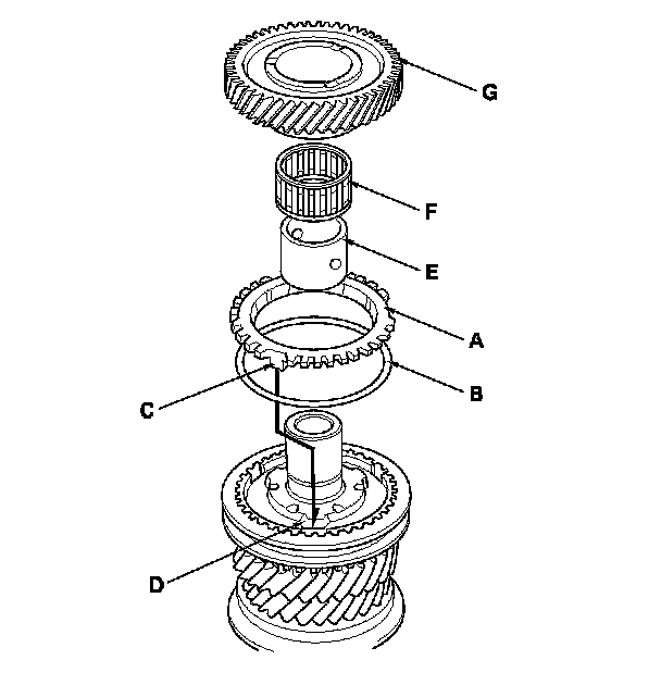15. Install the 6th gear distance collar (E) with the needle bearing (F) and 6th gear (G).