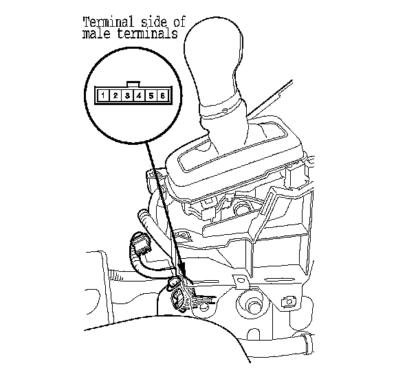 4. Shift out of P, and check for continuity between connector terminals No. 1 and No. 2.