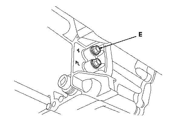24. Upshift to 4th gear by pressing the paddle shifter + (upshift switch), and measure the 4th clutch pressure at the 4th clutch pressure inspection port (E) while holding the engine speed at 2,000 rpm.