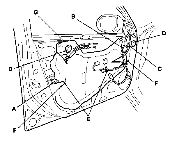 4. Disconnect the power door lock actuator connector (A) and the power mirror connector (B), and detach the harness clip (C). Remove the plug caps (D).