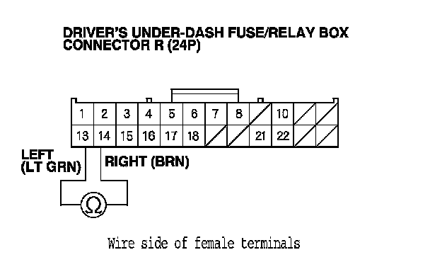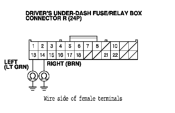 12. Check for continuity between driver's under-dash fuse/relay box connector R (24P) terminals No. 13 and No. 14.