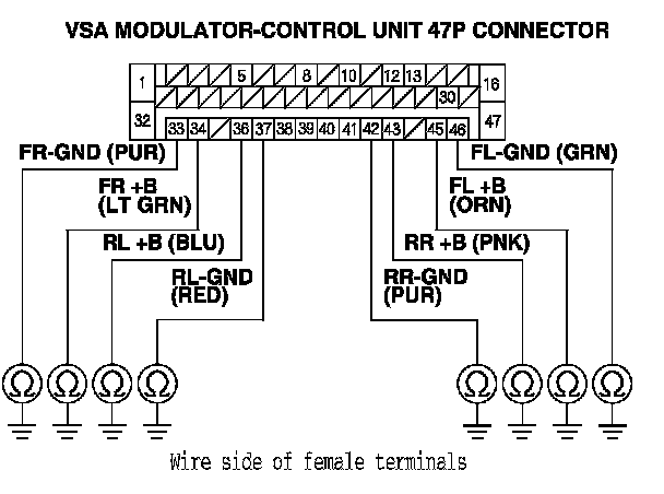 16. Check for continuity between body ground and the appropriate wheel speed sensor +B and GND terminals of the VSA modulator-control unit 47P connector individually (see table).