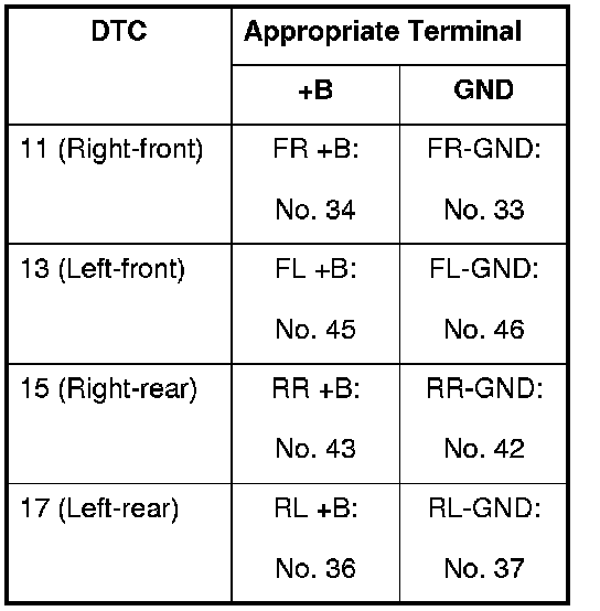 DTC 11, 13, 15, 17: Wheel Speed Sensor (Short to Power/Short to Body Ground/Open)