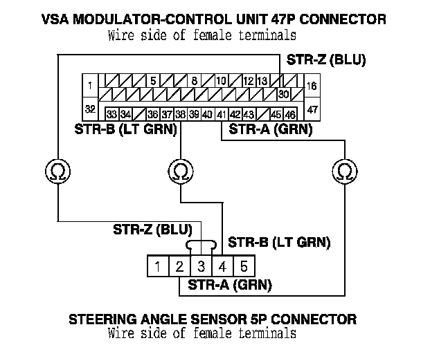 NO - Intermittent failure, the system is OK at this time. Check for loose terminals between the steering angle sensor 5P connector and the VSA modulator-control unit 47P connector. Refer to intermittent failures troubleshooting. Reading and Clearing Diagnostic Trouble Codes