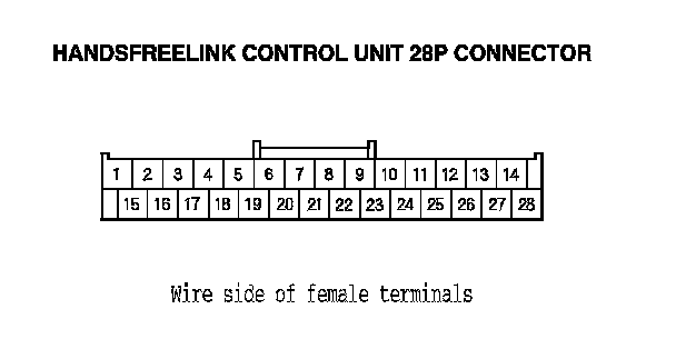 12. Check for continuity between the terminals of the HandsFreeLink control unit 28P connector according to the table.