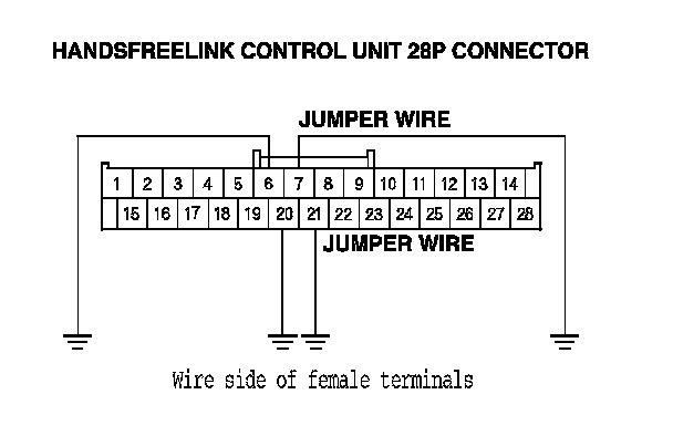 13. Connect HandsFreeLink control unit 28P connector terminals No. 6, No. 7, No. 20, and No. 21 to body ground with jumper wires.