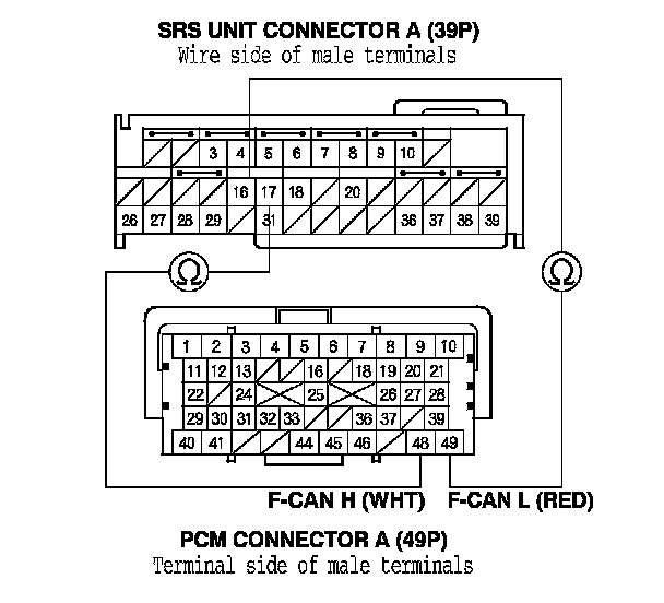 11. Check for continuity between SRS unit connector A (39P) terminal No. 16 and PCM connector A (49P) terminal No. 49, and between SRS unit connector A (39P) terminal No. 17 and PCM connector A (49P) terminal No. 48.