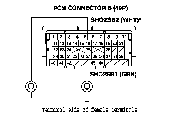 18. Check for continuity between PCM connector terminal B25 (B16)* and body ground.