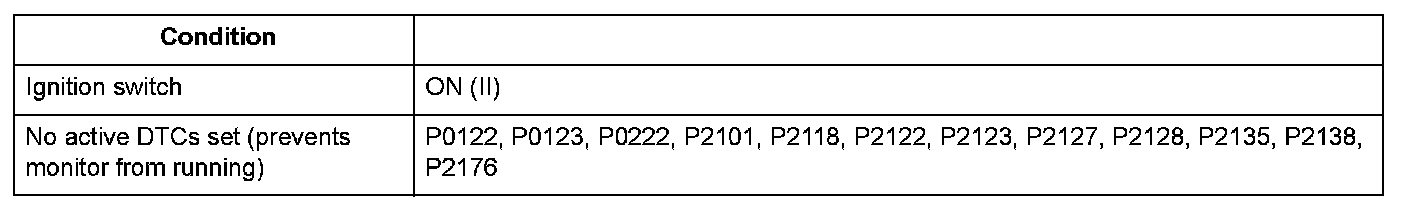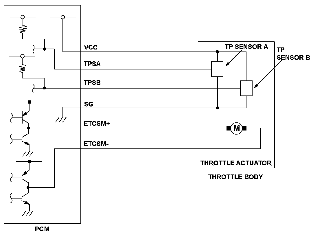 The electronic throttle control system controls the throttle valve opening. The system includes the throttle actuator, the throttle valve, throttle position (TP) sensors A and B, the electronic throttle control system (ETCS) control relay, the accelerator pedal position (APP) sensor, and the powertrain control module (PCM). TP sensor B is a semiconductor type, and it is attached to the throttle body and shaft to determine throttle valve position. The throttle valve position signal from TP sensor B is transmitted to the PCM for target position feedback control. If the signal from TP sensor B is a fixed value for a set time, the PCM detects a TP sensor B malfunction and stores a DTC.