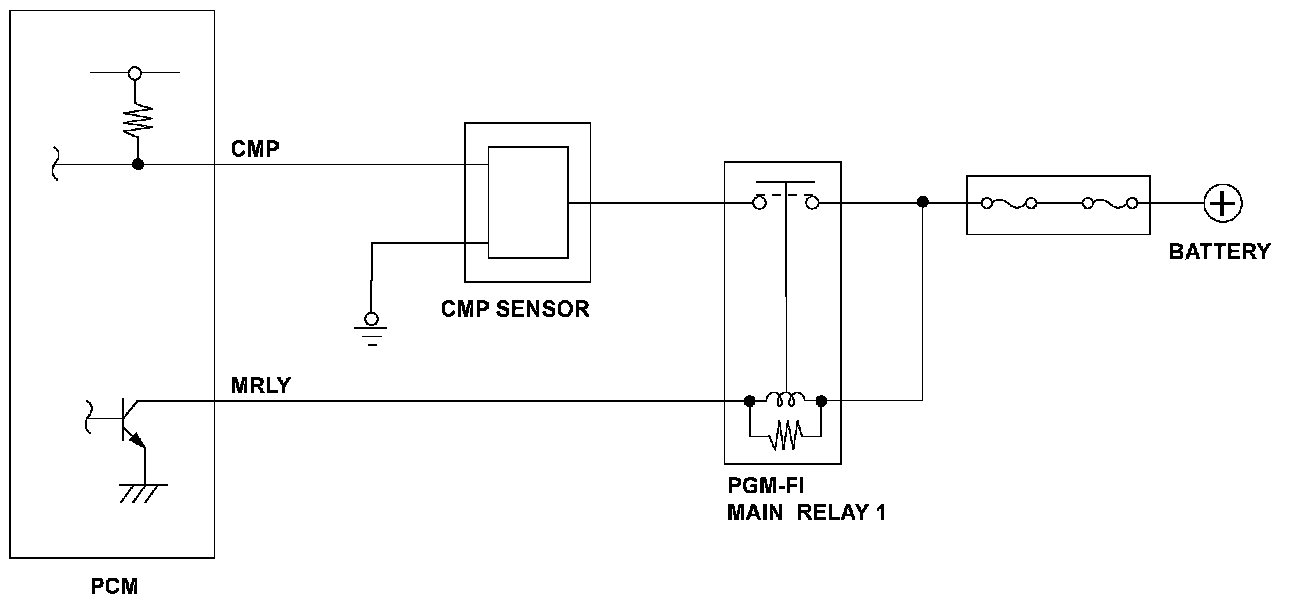 The camshaft position (CMP) sensor consists of a rotor and a semiconductor that detects rotor position. When the rotor turns after starting the engine, the changes of magnetic flux in the semiconductor are converted into pulsing signals to the powertrain control module (PCM). The CMP sensor detects the top dead center of each cylinder for fuel injection timing. If CMP sensor pulsing signals are detected an abnormal number of times due to noise, a malfunction is detected and a DTC is stored.