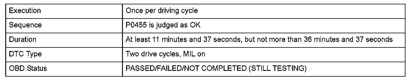 After the engine has stopped, the powertrain control module (PCM) monitors the variation of the FTP sensor output to detect "no 0.09 inch leak" depending on the variation of the pressure inside the fuel tank.