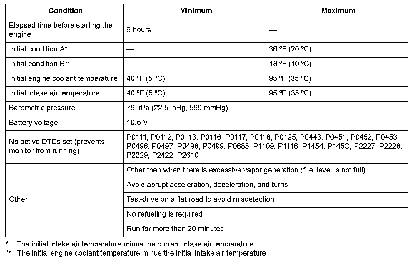 When a malfunction is detected during the first drive cycle with the ECT and IAT at engine start-up within the specified temperature range, a Pending DTC is stored in the PCM memory. If the malfunction returns in the next (second) drive cycle with the ECT and IAT at engine start-up within the specified temperature range, the MIL comes on and a Confirmed DTC and the freeze data are stored.