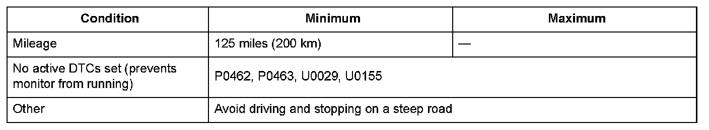 Drive for the specified mileage under Enable Conditions without refueling (turning the ignition switch to LOCK (0) is acceptable).