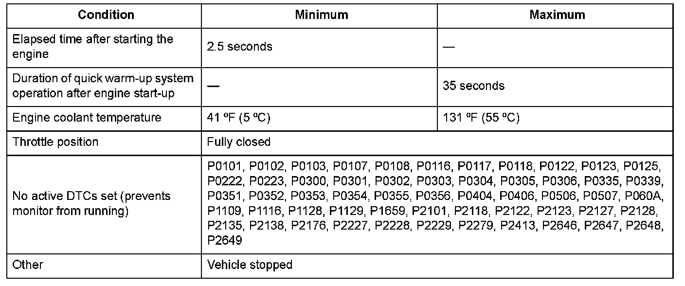 The quick warm-up system supplies additional air and retards the ignition timing when the engine is cold to activate the catalytic converter as quickly as possible. When the actual engine speed is a specified fast idle value, and it continues for a specified time, a malfunction is detected and a DTC is stored.