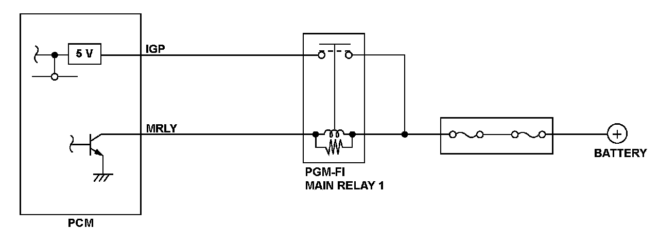 If there is a short to ground in the harness between the powertrain control module (PCM) and PGM-FI main relay 1, PGM-FI main relay 1 stays ON even if the ignition switch is turned to LOCK (0), and the PCM remains active. However, the engine is not running because power for the gauges, the ignition, and the fuel pump is turned OFF by the ignition switch. When the PCM operates for a set time after the ignition switch is turned to LOCK (0), a malfunction is detected and a DTC is stored.