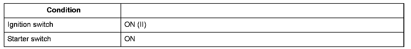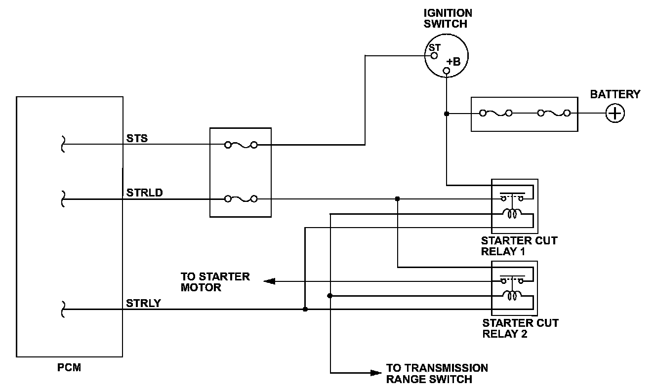 A starter switch inhibit system prevents damaging the starter pinion gear by prohibiting starter activation while the engine is running. If the ignition switch is turned to START (III) mistakenly while the engine is running, the powertrain control module (PCM) prevents the starter from working according to the engine speed information and the output (STRLY) signal of the starter cut relay is switched to LOW. In this system, two starter cut relays are connected in series (starter cut relay 1, starter cut relay 2) to prevent the starter from continuing to run due to a starter cut relay malfunction. Also a diagnosis line (STRLD) is used to monitor voltage in the middle of starter cut relay 1 and starter cut relay 2. The PCM detects an OPEN malfunction, an ON malfunction of starter cut relay 1, and an ON malfunction of starter cut relay 2. If the voltage on the diagnosis line (STRLD) input does not exceed upper and lower limits for a specified duration when the ignition switch is turned to START (III) and the output of the starter cut relay (STRLY) is HIGH (starter ON), the PCM detects an OPEN malfunction of the diagnosis line and stores a DTC.