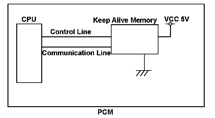 The powertrain control module (PCM) is equipped with a keep alive memory. The data (control learn data, etc.) for powertrain control and information (vehicle identification number (VIN), etc.) related to the vehicle control is stored in the keep alive memory, so that it can be maintained even when power is not supplied to the PCM, such as when the battery is disconnected. When power is restored to the PCM, the CPU retrieves the stored information from the keep alive memory, but when the data retrieval process is not finished normally, a malfunction is detected and a DTC is stored. The CPU writes data to the keep alive memory from the CPU: Control related data is written when the ignition switch is turned to ON (II), and vehicle information when commanded from the HDS. If the data writing process is not completed normally, a malfunction is detected and a DTC is stored.