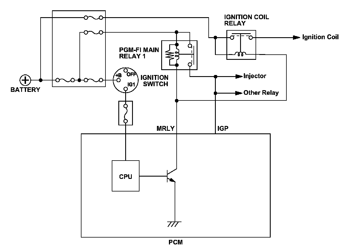 After the ignition switch is turned to LOCK (0), the powertrain control module (PCM) does not shut down immediately. After finishing a predetermined process according to the request of each device and system, the power supply is automatically disconnected (self shut-down function). The PCM power is disconnected by controlling PGM-FI main relay 1. During a normal PCM shut down, the shut down process is executed by the CPU, PGM-FI main relay 1 is turned off, and the voltage to the PCM is turned off to shut down the PCM. When the voltage to the PCM is turned off and the PCM shuts down without the normal shut down procedure, the PCM detects a malfunction in the PGM-FI main relay 1 control circuit and stores a DTC.