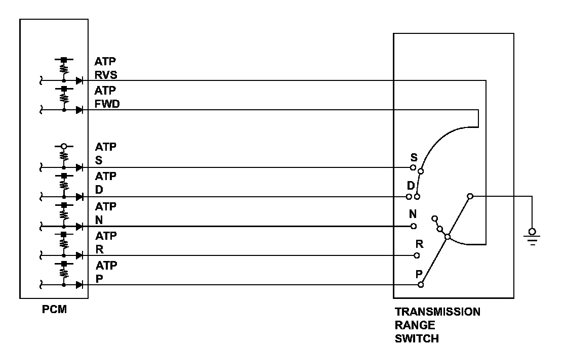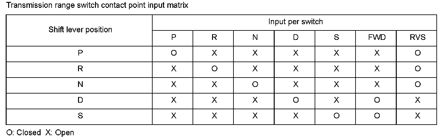 The transmission range switch is attached to a control shaft. Operating the shift lever makes the control shaft rotate via the shift cable. The A/T gear position indicator shows which position is selected according to the Low/High signal combinations, which vary based on the control shaft rotational angle. The control shaft changes the position of the transmission range switch, activates the manual valve, and switches hydraulic pressure to shift the transmission through forward/neutral/reverse. The transmission range switch signal is used to determine the shift schedule. The voltage is high (5V or 12 V) at the powertrain control module (PCM) input terminal when each transmission range switch position is open, and it is low (0 V) when each switch is closed. If the FWD switch stays open while the vehicle repeatedly accelerates to a specified vehicle speed and then stops despite being in D or S, the PCM detects a malfunction in the transmission range switch (open) and stores a DTC.