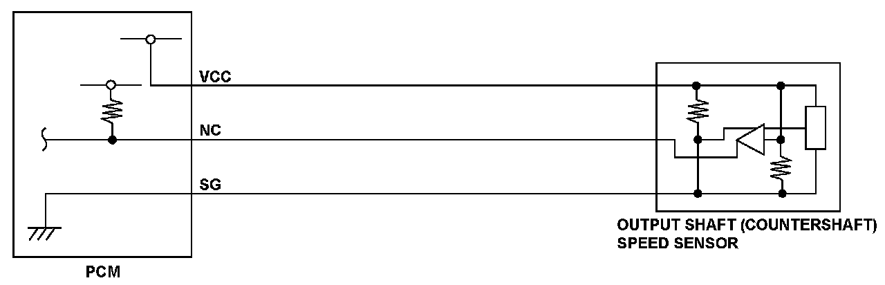 The output shaft (countershaft) speed sensor is attached to the outside of the transmission housing. The output shaft (countershaft) speed sensor generates a pulsing signal according to the speed of the park gear on the output shaft (countershaft). Using that signal, the powertrain control module (PCM) determines the speed of the output shaft (countershaft). If pulse dropouts occur with the output shaft (countershaft) rotating, the PCM detects a malfunction that may be caused by an open, a temporary open, or a short to ground. Based on the correlation between the vehicle speed measured by the output shaft (countershaft) speed sensor and the input shaft (mainshaft) speed sensor, the PCM detects a malfunction and stores a DTC.