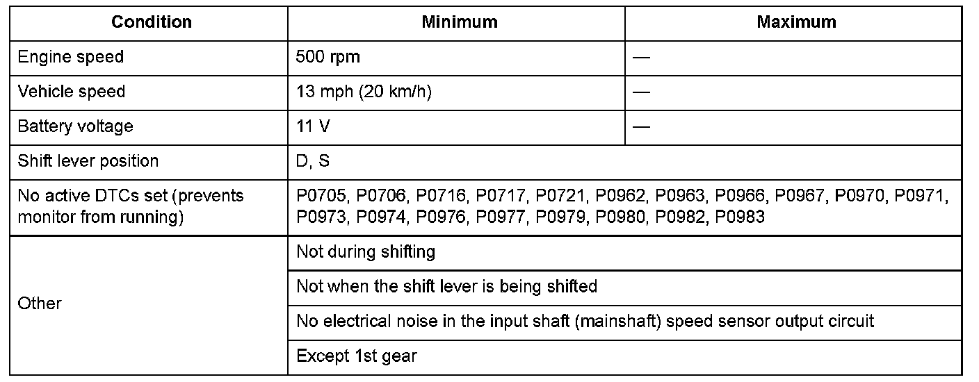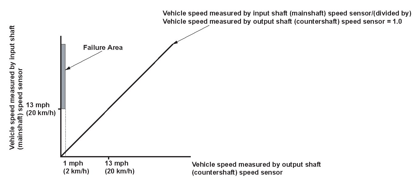 When the vehicle speed measured by the input shaft (mainshaft) speed sensor is 13 mph (20 km/h) or more, the vehicle speed measured by the output shaft (countershaft) speed sensor is 1 mph (2 km/h) or less for at least 10 seconds.