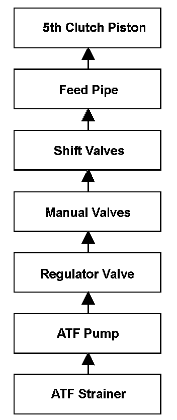 To engage 5th gear, line pressure is supplied to the 5th clutch piston, engaging the 5th clutch, and the input shaft (mainshaft) and the input shaft (mainshaft) 5th gear are connected and revolve together. Hydraulic pressure is supplied to the 5th clutch through the ATF strainer --> the ATF pump --> the regulator valve --> the manual valve --> the shift valves --> the feed pipe --> the 5th clutch piston. (A shift valve failure in the supply route above is detected by the malfunction detection of each shift solenoid valve.) The powertrain control module (PCM) computes the ratio of the input shaft (mainshaft) speed to the output shaft (countershaft) speed. When the ratio is not the 5th gear ratio, the PCM detects a malfunction of the hydraulic circuit or the 5th clutch and stores a DTC.