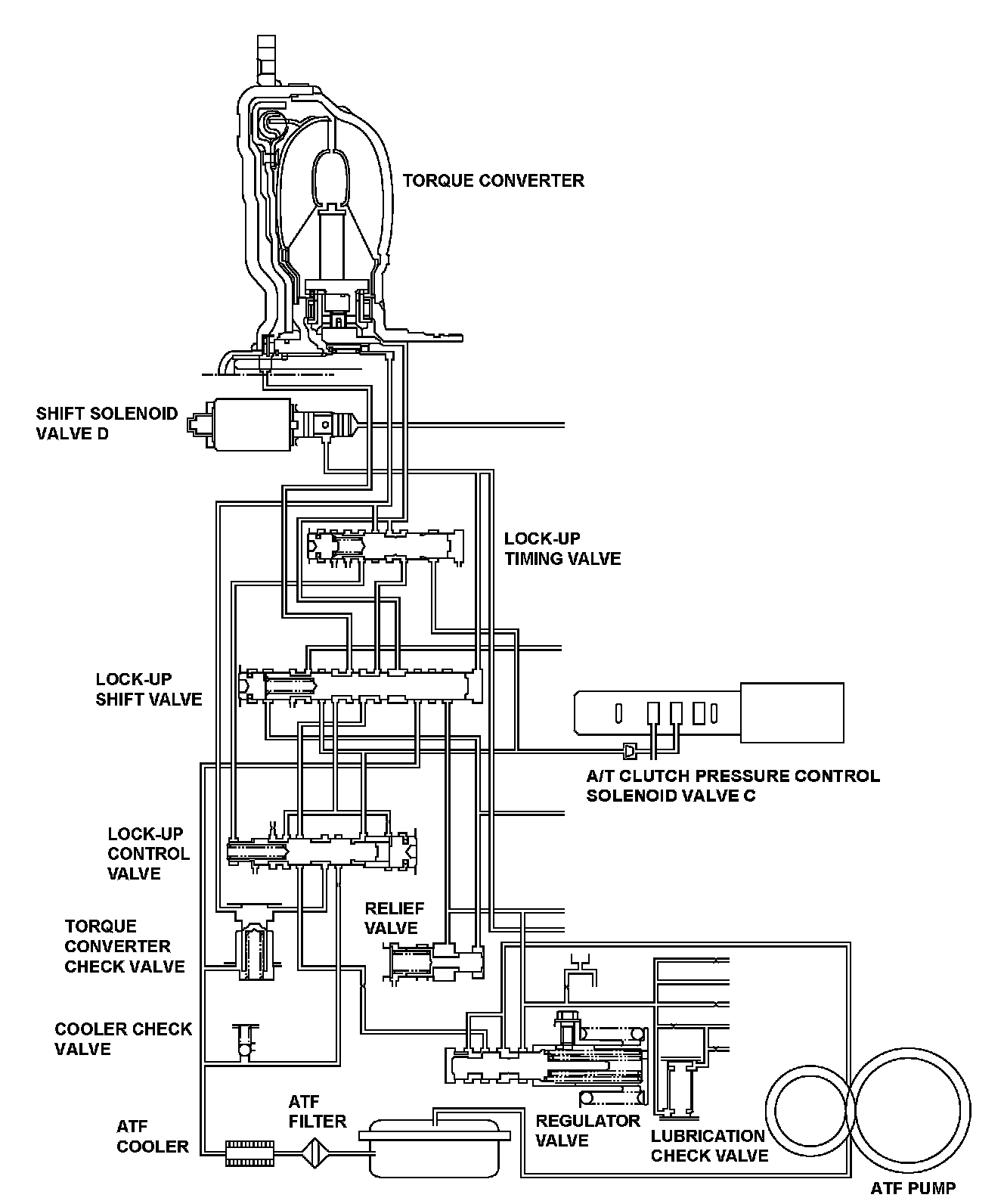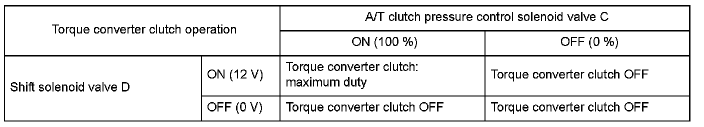 The power transfer capacity of the torque converter clutch is controlled by the balance of automatic transmission fluid (ATF) supply to and discharge from the torque converter. When hydraulic pressure is applied internally, the torque converter clutch turns ON, and when hydraulic pressure is applied from the back pressure side, the torque converter clutch turns OFF. As the hydraulic pressure from the internal pressure side increases, the power transfer capacity of the torque converter clutch increases. The direction of hydraulic pressure supply is switched by shift solenoid valve D and the lock-up shift valve. ATF is supplied from the internal pressure side to shift solenoid valve D when the signal from the powertrain control module (PCM) is ON (12 V), and ATF is supplied from the back pressure side when it is OFF (0 V). The balance of internal pressure and back pressure is controlled by A/T clutch pressure control solenoid valve B, the lock-up control valve, and the lock-up timing valve. A/T clutch pressure control solenoid valve C maximizes the power transfer capacity of the torque converter clutch when the signal from the PCM is ON (1 A), and it minimizes the power transfer capacity of the torque converter clutch when the signal from the PCM is OFF (0 A). If the ratio of engine speed and input shaft (mainshaft) speed is not about 1:1 while the PCM is issuing the command to turn shift solenoid valve D and A/T clutch pressure control solenoid valve C ON, the PCM detects a faulty lock-up control system and stores a DTC.