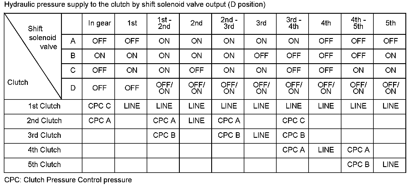 A/T clutch pressure control solenoid valve A is installed in the transmission housing. A/T clutch pressure control solenoid valve A is operated by the powertrain control module (PCM) and converts the modulated pressure to A/T clutch pressure control solenoid valve A pressure, which operates CPC valve A. Line pressure is modulated to clutch pressure control A pressure (CPC A pressure) by CPC valve A and the CPC valve A spring. A signal from the PCM is output to the proper gear clutch, determined by the gear schedule, to supply the proper CPC pressure according to the driving conditions. When the current from the PCM is high (ON), A/T clutch pressure control solenoid valve A operates and the CPC valve A pressure increases. When the current from the PCM is low (OFF), A/T clutch pressure control solenoid valve A turns off and CPC valve A pressure decreases. The PCM monitors the input shaft (mainshaft) speed and the output shaft (countershaft) speed at the gear change determined by the shift schedule. When an improper gear ratio is output compared to the predetermined gear ratio, the PCM detects an A/T clutch pressure control solenoid valve A OFF failure and stores a DTC.