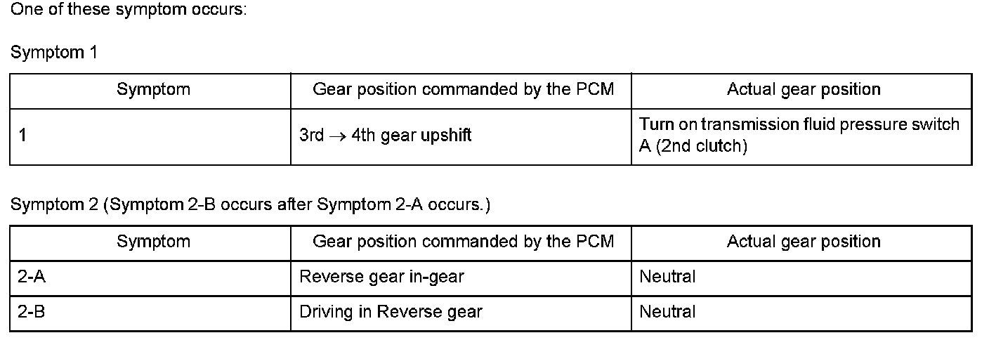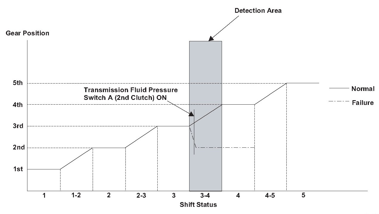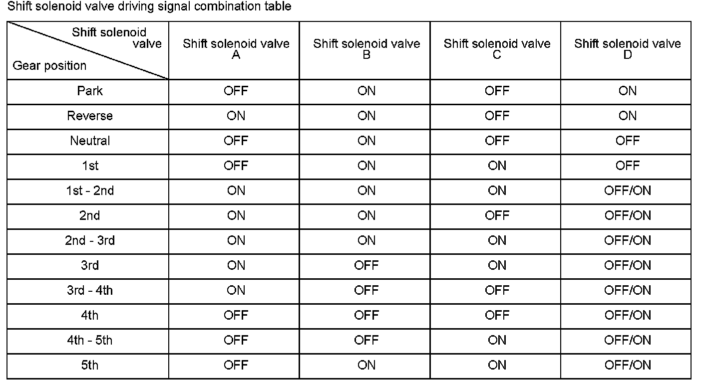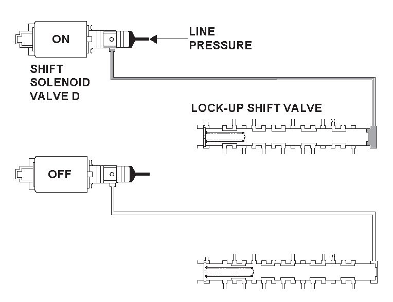 Shift solenoid valve D is installed in the transmission housing. It is controlled by the ON/OFF signal from the powertrain control module (PCM) to apply modulated pressure to the lock-up shift valve. The signal from the PCM is output to apply clutch pressure control pressure to the proper gear clutch according to the gear change schedule. When the signal to shift solenoid valve D from the PCM is ON, and modulated pressure is applied to the lock-up shift valve, it operates against the lock-up shift valve spring. When the signal to shift solenoid valve D from the PCM is OFF, and modulated pressure is discharged, the lock-up shift valve is inactive. The PCM monitors the input shaft (mainshaft) speed and the output shaft (countershaft) speed at the gear change determined by the shift schedule. When an improper gear ratio is output compared to the predetermined gear change mode, the PCM detects a shift solenoid valve D OFF failure and stores a DTC.