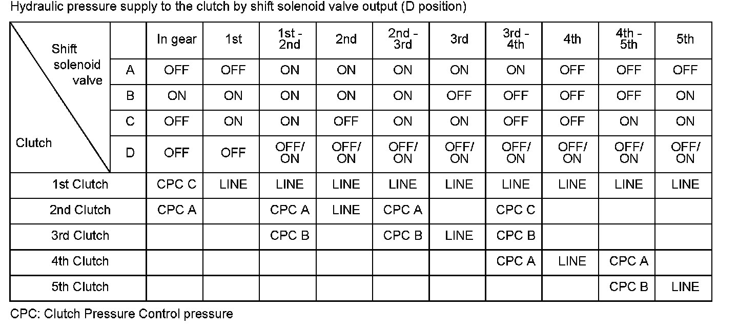 A/T clutch pressure control solenoid valve C is installed in the transmission housing. A/T clutch pressure control solenoid valve C is operated by the powertrain control module (PCM) and converts the modulated pressure to A/T clutch pressure control solenoid valve C pressure, which operates CPC valve C. Line pressure is modulated to clutch pressure control C pressure (CPC C pressure) by CPC valve C and the CPC valve C spring. A signal from the PCM is output to the proper gear clutch, determined by the gear schedule, to supply the proper CPC pressure according to the driving conditions. When the current from the PCM is high (ON), A/T clutch pressure control solenoid valve C operates and the CPC valve C pressure increases. When the current from the PCM is low (OFF), A/T clutch pressure control solenoid valve C turns off and CPC valve C pressure decreases. The PCM monitors the input shaft (mainshaft) speed and the output shaft (countershaft) speed at the gear change determined by the shift schedule. When an improper gear ratio is output compared to the predetermined gear ratio, the PCM detects an A/T clutch pressure control solenoid valve C OFF failure and stores a DTC.