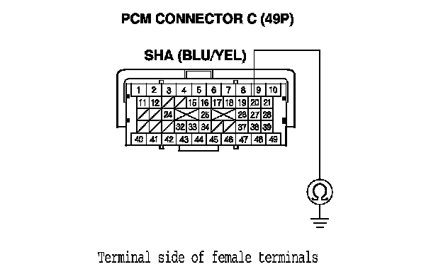 16. Measure the resistance between PCM connector terminal C20 and body ground.