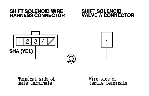 20. Check for continuity between shift solenoid wire harness connector terminal No. 3 and the shift solenoid valve A connector terminal.