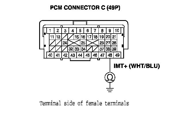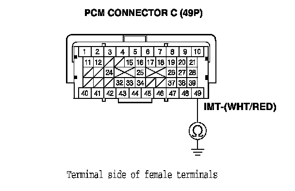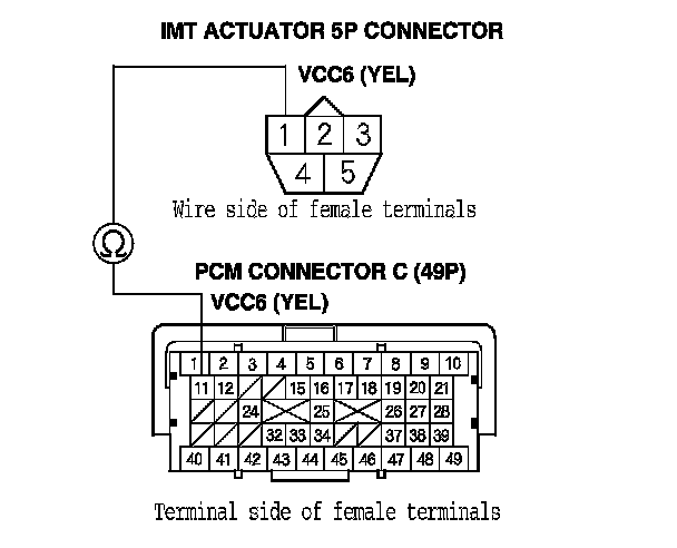 24. Check for continuity between IMT actuator 5P connector terminal No. 4 and PCM connector terminal C49.