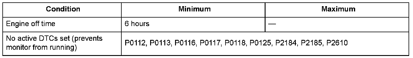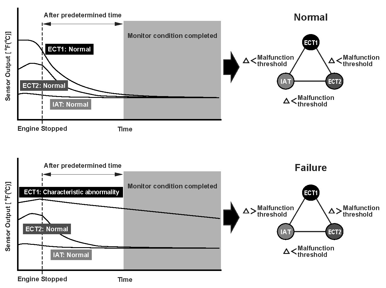 Two engine coolant temperature sensors and one intake air temperature sensor are used by the powertrain control module (PCM). When the engine is stopped and enough time has passed, the temperature of the engine will equalize to the ambient temperature. When an inappropriate temperature is detected after comparing the temperature readings of each sensor, the PCM detects a malfunction in the corresponding sensor and stores a DTC.