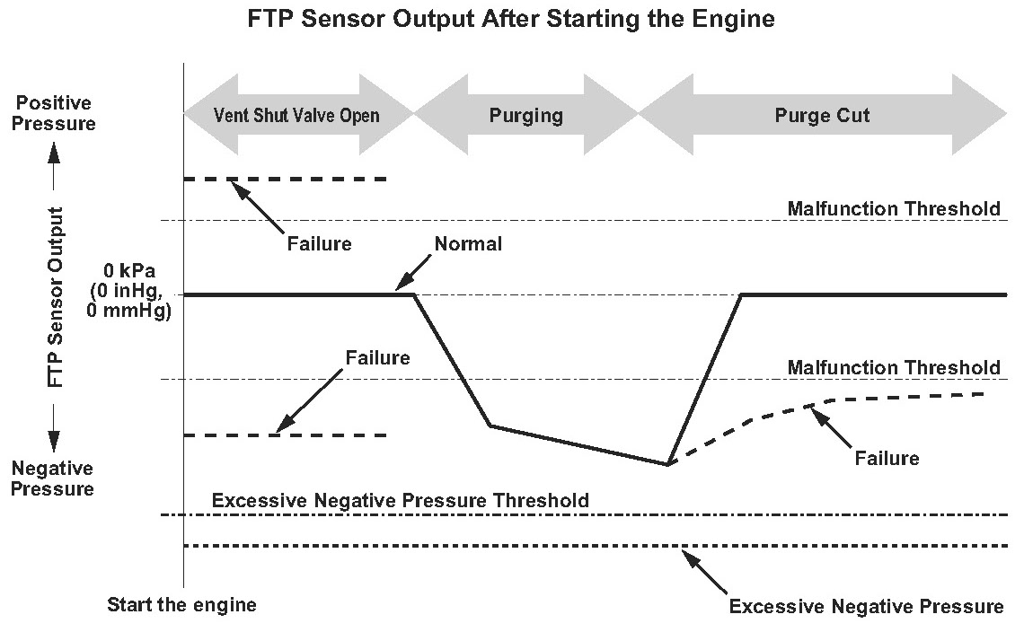 - The FTP sensor output fluctuates by 1.4 kPa (0.4 inHg, 10 mmHg) or more, or -0.7 kPa (-0.2 inHg, -5 mmHg) or less, for at least 10 seconds.