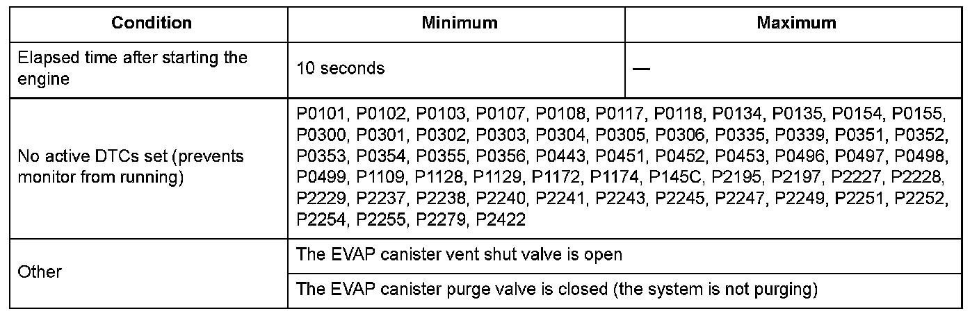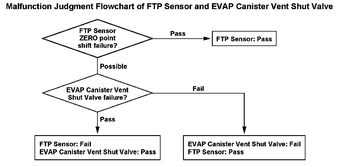 The fuel tank pressure is about 0 kPa (0 inHg, 0 mmHg) when starting a cold engine. When the fuel tank pressure (FTP) sensor output value is out of a specified range and the powertrain control module (PCM) judges that there's no other cause [no evaporative emission (EVAP) canister vent shut valve failure, etc.] for the FTP sensor zero point shift, the PCM detects an FTP sensor malfunction. However, if the FTP sensor output when starting the engine, is a prescribed negative value or less (excessive negative pressure is detected), the malfunction judgment should be done as follows because it is difficult to distinguish the FTP sensor zero point shift (P1454) from the EVAP canister vent shut valve failure (P2422).