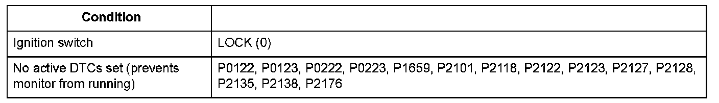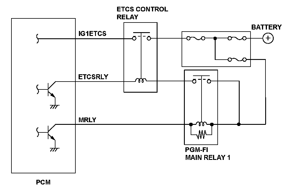 The electronic throttle control system controls the throttle valve opening. The system includes the throttle actuator, the throttle valve, throttle position (TP) sensors A and B, the electronic throttle control system (ETCS) control relay, the accelerator pedal position (APP) sensor, and the powertrain control module (PCM). When the accelerator pedal is pressed, the APP sensor detects the accelerator opening value. The accelerator pedal opening value is converted to a signal in the APP sensor and transmitted to the PCM to compute the target position. The PCM determines the throttle valve target position according to the signal received and operates the throttle actuator to move the throttle valve to the target position. The actual throttle valve position is determined by TP sensors A and B (installed in the throttle body). When the voltage is applied from the ETCS control relay to the IG1ETCS terminal for a set time after the ETCS control relay is turned off, the PCM detects a malfunction in the ETCS control relay power switch and stores a DTC.