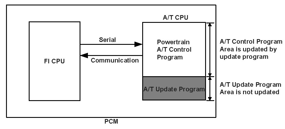 The control program in the powertrain control module (PCM) has a rewriting function that can be done in the field. The programs in the PCM CPU are the powertrain control program (rewritable program) and the update program (non-rewritable program). When the program rewriting process is not finished normally, such as turning off the PCM power during the rewriting process, and then turning the ignition switch to ON (II) again, the A/T CPU starts according to the rewriting function program, and this DTC is sent to the FI CPU via serial communication and stored in the PCM.