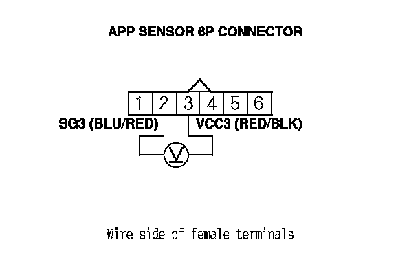 6. Measure the voltage between APP sensor 6P connector terminals No. 2 and No. 3.